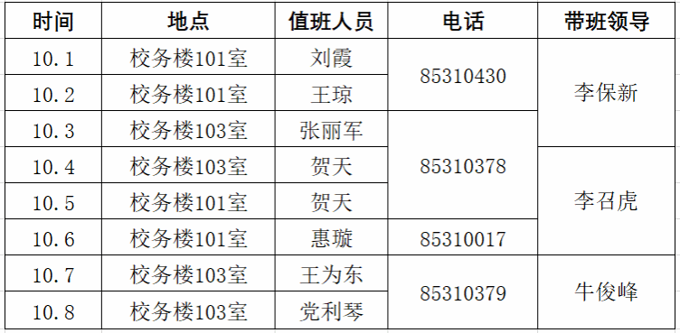 根据学校《2025年国庆节、中秋节放假调休的通知》要求,现将太阳集团tcy8722假期值班安排如下: